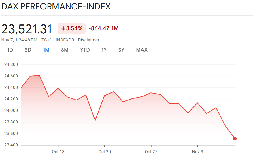 Der deutsche Leitindex Dax hat am Freitag seine anfänglichen Gewinne rasch abgegeben und rutschte im Verlauf des Handelstages spürbar ins Minus. Am Nachmittag notierte der Index 0,8 Prozent tiefer bei 23.538 Punkten, nachdem er zwischenzeitlich auf ein Tagestief von 23.477 Zählern gefallen war. Damit setzte sich der jüngste Abwärtstrend fort, der bereits in den vergangenen Handelstagen deutlich geworden war.
