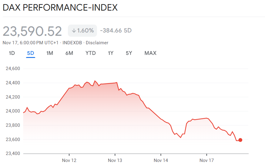 Der deutsche Aktienmarkt hat eine weitere belastende Sitzung hinter sich. Der Dax gab am Montag um 1,2 Prozent nach und beendete den Xetra-Handel bei 23.591 Punkten. Auch der europäische Leitindex EuroStoxx50 konnte sich der negativen Stimmung nicht entziehen und schloss 1,1 Prozent tiefer bei 5630 Zählern.