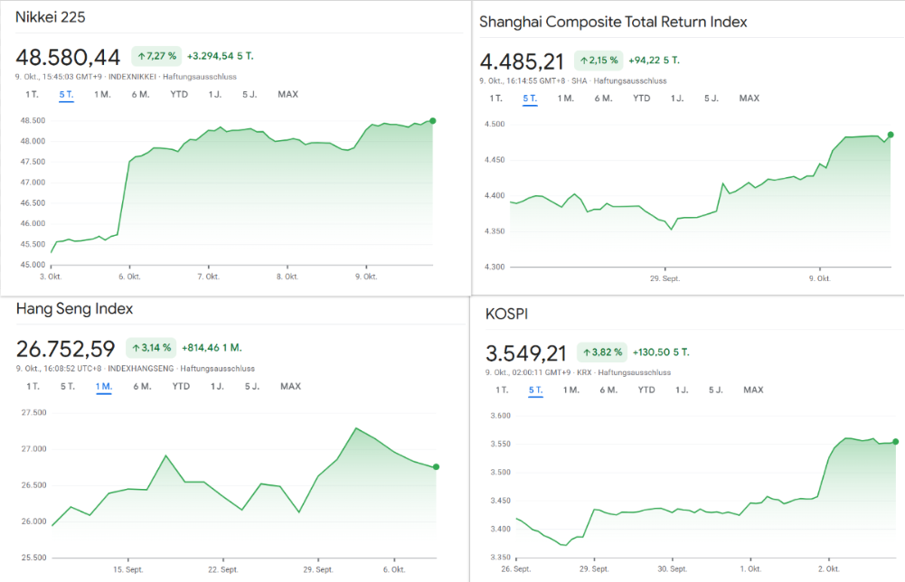 Die asiatischen Aktienmärkte zeigen sich am Donnerstag in glänzender Verfassung. Besonders in Japan und China legten die Kurse kräftig zu. Der Nikkei-Index stieg um 1,5 Prozent auf 48.436 Punkte und erreichte damit erneut ein Rekordniveau. Auch in Schanghai endete der Feiertagshandel der „Golden Week“ mit deutlichen Gewinnen – der Shanghai Composite kletterte um 1,2 Prozent.