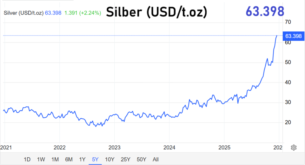 Auch Silber verzeichnet einen außergewöhnlich starken Lauf und erreicht ein neues Allzeithoch, was die hohe Nachfrage nach Edelmetallen zusätzlich unterstreicht.