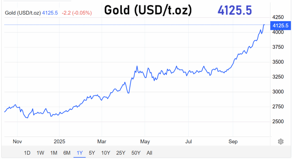 Der Goldpreis hat eine neue historische Marke erreicht und zeigt keine Anzeichen einer Abschwächung. Angetrieben wird die Rally von der wachsenden Hoffnung auf Zinssenkungen in den USA sowie der gestiegenen Nachfrage nach sicheren Anlageformen. Gleichzeitig verschärfen sich die Spannungen zwischen den Vereinigten Staaten und China, was die Attraktivität des Edelmetalls zusätzlich erhöht.