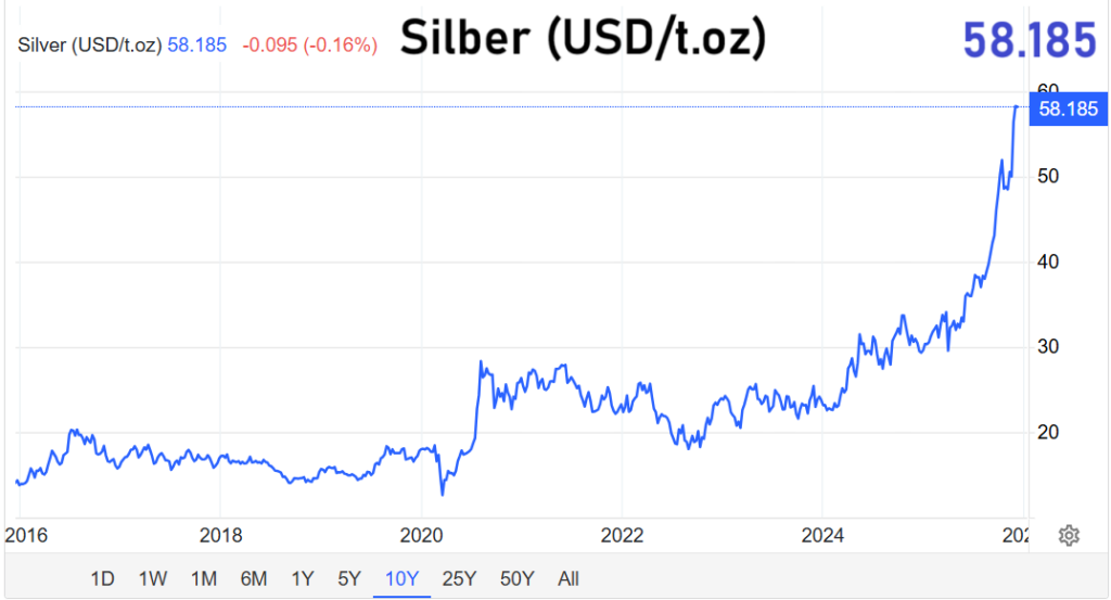 Noch deutlicher fällt der Preisanstieg bei Silber aus. Seit dem Start des Schlussquartals legte das Metall um rund 25 Prozent zu und übertraf damit die Performance von Gold deutlich.